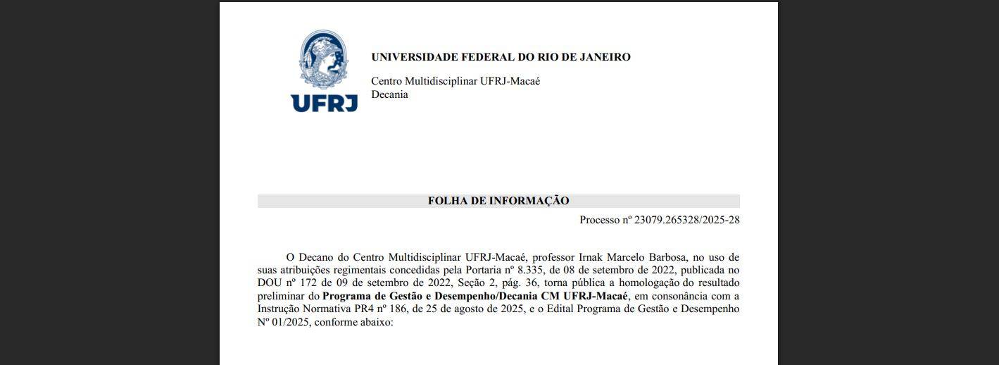 Apresentação novo Resultado preliminar das inscrições do PGD 2026 da Decania do CM UFRJ-Macaé é divulgadoResultado preliminar das inscrições do PGD 2026 da Decania do CM UFRJ-Macaé é divulgadoResultado Final.Resultado Final.Edital do PGD da Decania para o ano de 2026.Edital do PGD da Decania para o ano de 2026.Abertas as inscrições para o Processo Seletivo Simplificado para Professores Substitutos (Contratação Temporária)Abertas as inscrições para o Processo Seletivo Simplificado para Professores Substitutos (Contratação Temporária)🎓 Oportunidade no AFIRMASUS/UFRJ-Macaé!🎓 Oportunidade no AFIRMASUS/UFRJ-Macaé! Acesso à GraduaçãoConheça nossos cursos de GraduaçãoPós-Graduação Programas de pesquisa A Universidade além do Campus: nosso trabalho com a comunidade Nosso trabalho pensando no futuro Agenda 13h – Encontro Docência Universitária. 10h – ICT Academy. 08h às 18h – Seminário de Educação Bilíngue de Surdos – Macaé-RJ (CPAI) 18h – Aula aberta da Liga de Ginecologia e Obstetrícia. Principais serviços e informações Reserva de auditório Mapa e reserva de salas de aula Secretaria Acadêmica Transporte Interpolos Assistência Estudantil Calendário Acadêmico Biblioteca Vmail UFRJ Sistema Eletrônico de Informações (SEI) Órgãos Suplementares Instituto de Alimentação e Nutrição Instituto de Ciências Farmacêuticas Instituto de Ciências Médicas Instituto de Enfermagem Instituto Multidisciplinar de Química Instituto Politécnico